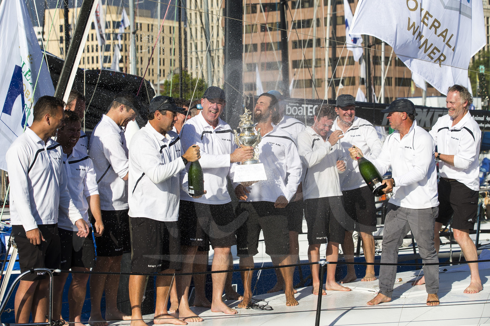 | Description | HOBART, AUSTRALIA - DECEMBER 29: Overall winner Maxi yacht Ichi Ban crew celebrate with champagne and trophy during the 2019 Sydney to Hobart race finish on December 29, 2019 in Hobart, Tasmania, Australia. (Photo by Andrea Francolini/Alea) |