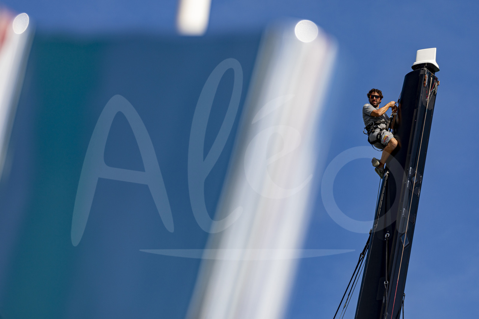 | Description | AUCKLAND, NEW-ZEALAND - MARCH 15: Luna Rossa Prada Pirelli Team member up the mast and the Prada Cup Trophy are illustrated in the race village during America's Cup, in Auckland, New Zealand, on March 15, 2021. (photo by Stefano Gattini/Alea) |