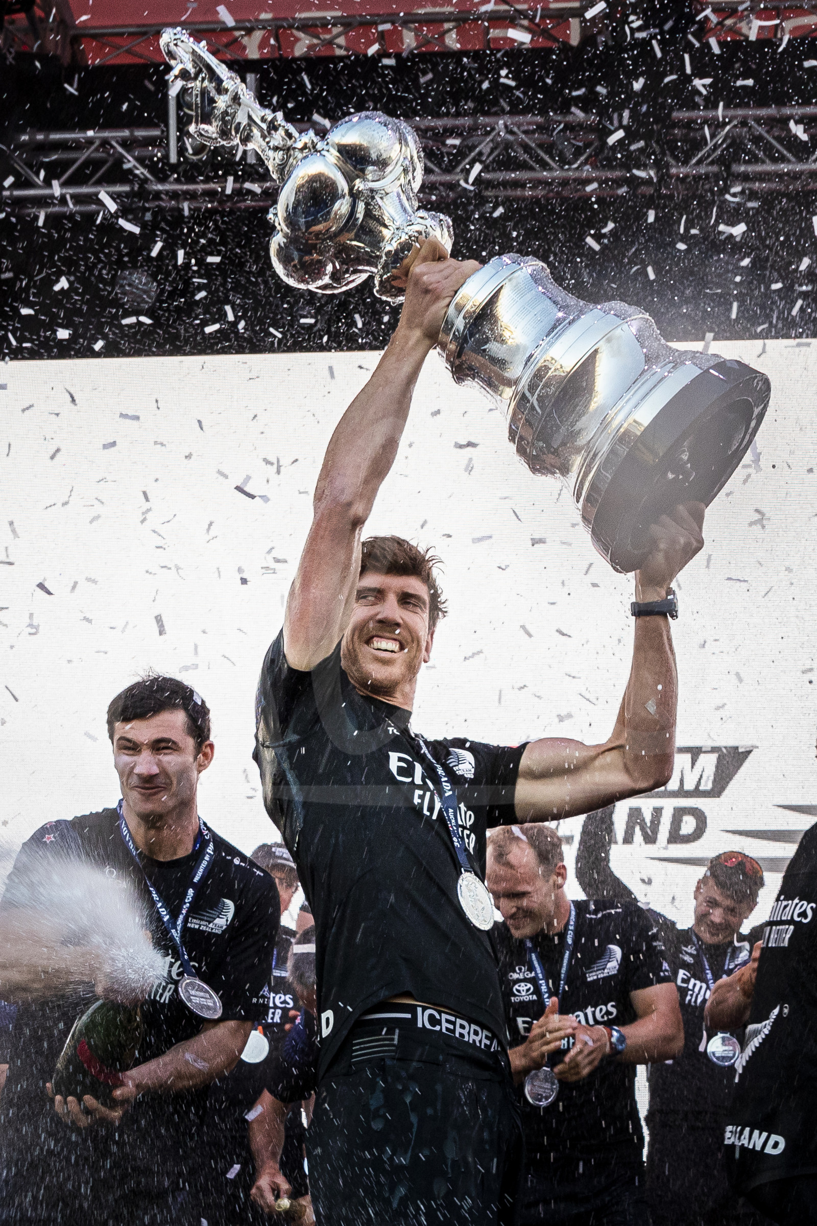 | Description | AUCKLAND, NEW-ZEALAND - MARCH 17: Emirates Team New Zealand sailor Peter Burling lifts the trophy at the prizegiving ceremony after winning the America's Cup presented by Prada, in Auckland, New-Zealand, on March 17, 2021. (photo by Stefano Gattini/Alea) |