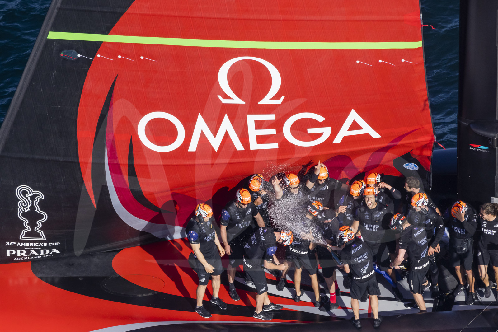 | Description | AUCKLAND, NEW-ZEALAND - MARCH 17: Emirates Team New Zealand crew members celebrate with champagne winning the America's Cup presented by Prada, in Auckland, New-Zealand, on March 17, 2021. (photo by Carlo Borlenghi/Alea) |