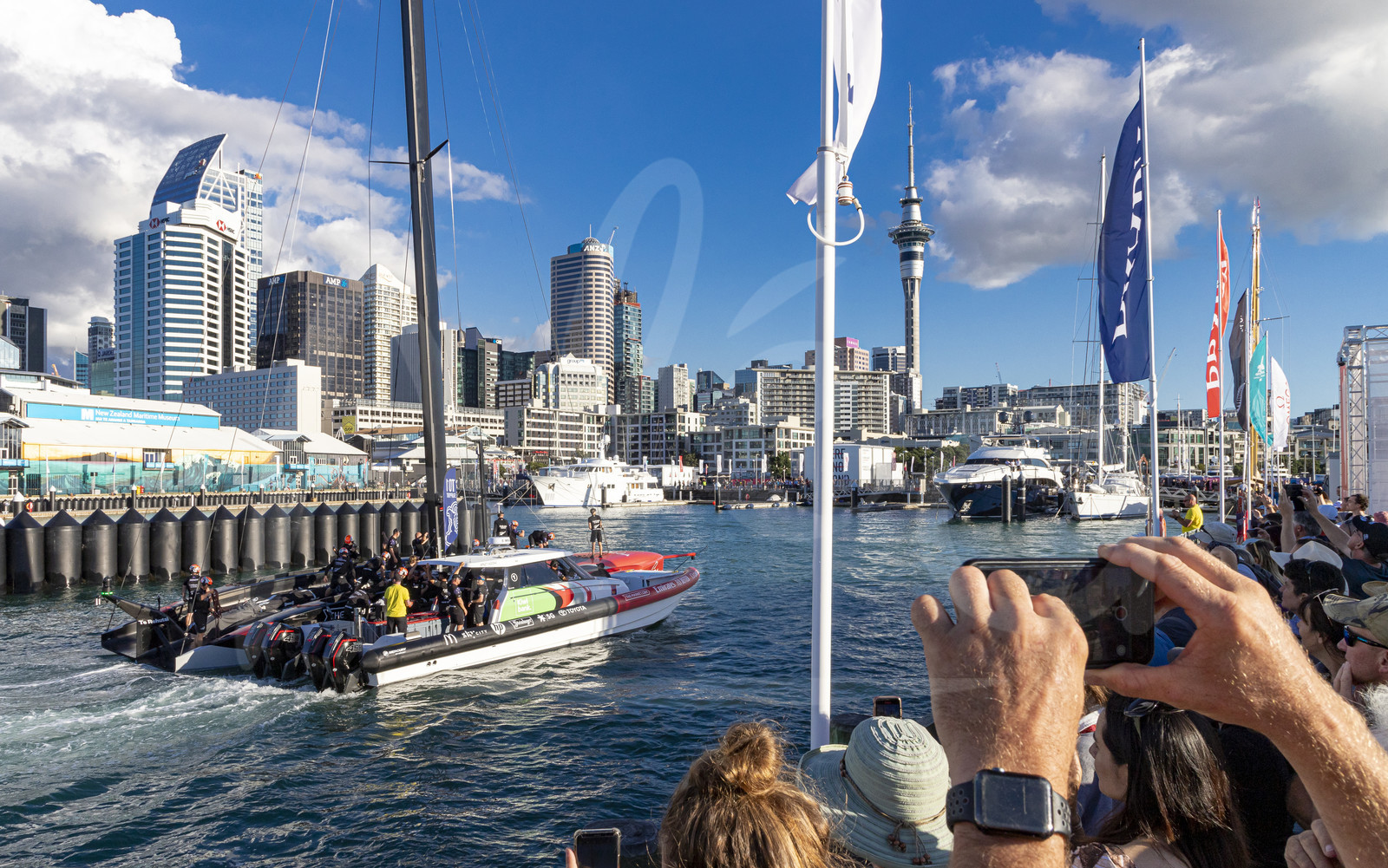 | Description | AUCKLAND, NEW-ZEALAND - MARCH 12: Emirates Team New Zealand and his chase boat are pictured by supporters during America's Cup, in Auckland, New Zealand, on March 12, 2021. (photo by Stefano Gattini/Alea) |
