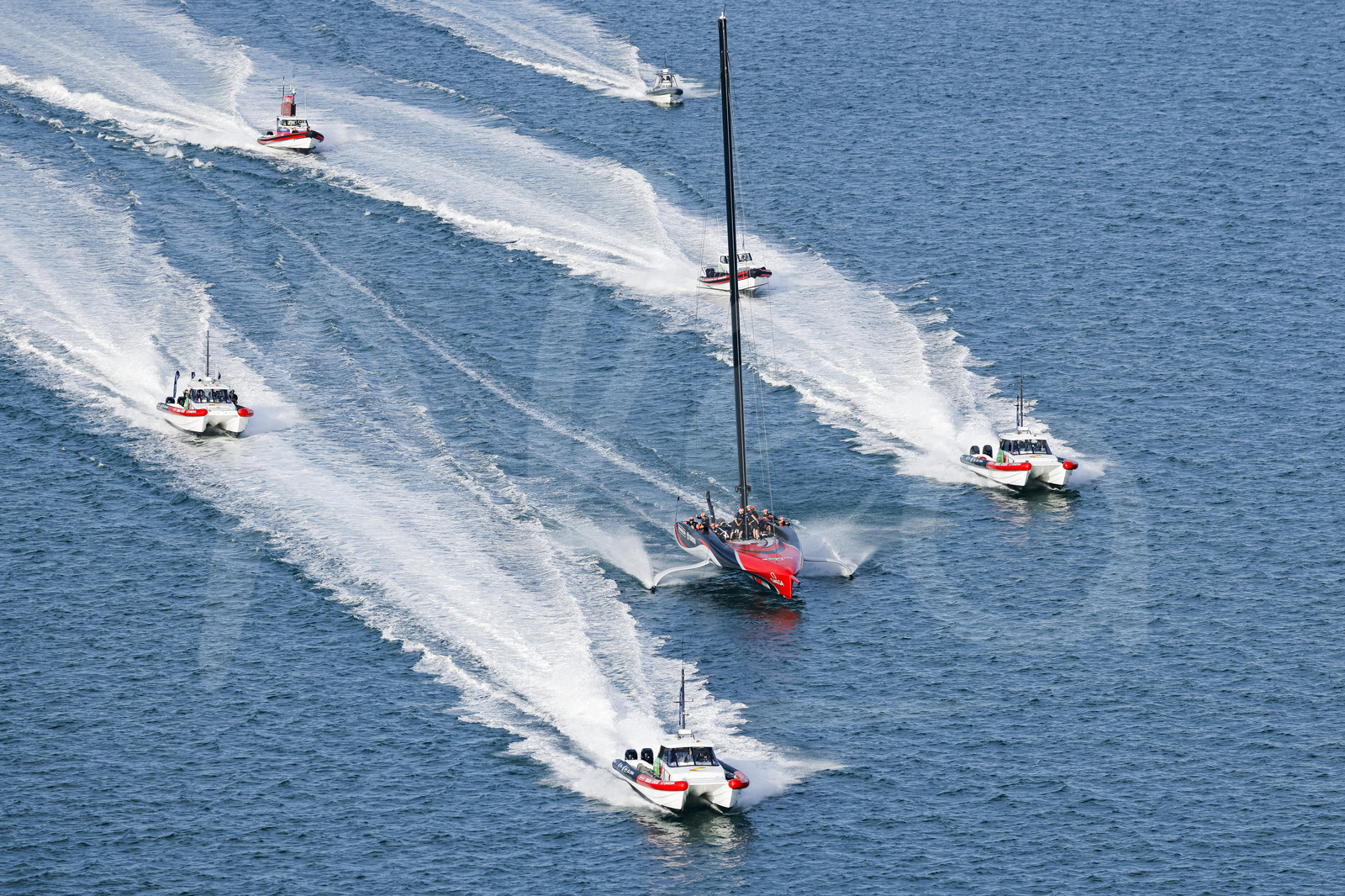 | Description | AUCKLAND, NEW-ZEALAND - MARCH 15: Emirates Team New Zealand is illustrated with chase boats on day five of the America's Cup presented by Prada, in Auckland, New-Zealand, on March 15, 2021. (photo by Carlo Borlenghi/Alea) |