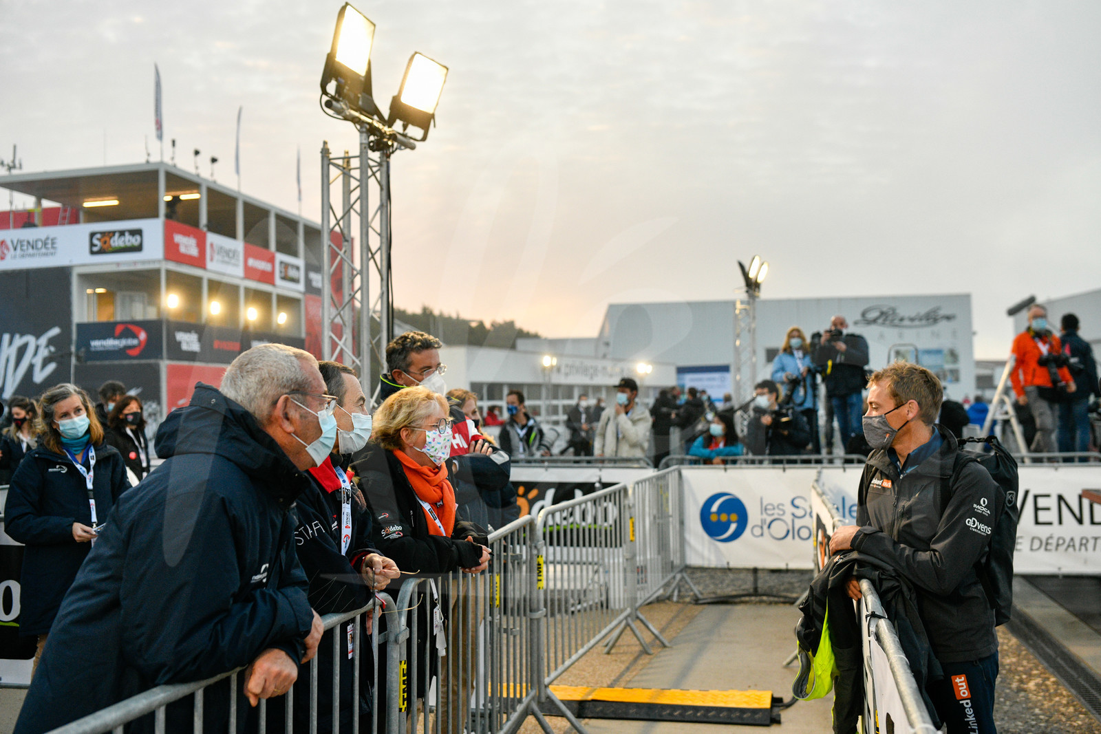 | Description | LES SABLES D’OLONNE, FRANCE - NOVEMBER 8: Skipper Thomas Ruyant, LinkedOut, is portraited at pontoons with Yves Auvinet (CG85 President) and officials before the start of the Vendee Globe sailing race in les Sables d’Olonne, France, on November 8, 2020. (Photo by Jean-Louis Carli/Alea) |