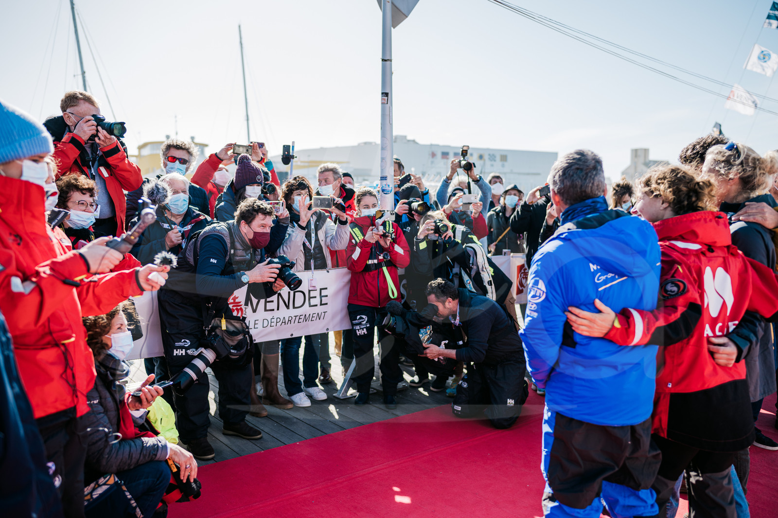 | Description | #EN# LES SABLES D’OLONNE, FRANCE - FEBRUARY 24: Skipper Isabelle Joschke, MACSF, is congratulated by Jean Le Cam, Miranda Merron and Manuel Cousin during arrival after retiring from the Vendee Globe sailing race, on February 24, 2021. (Photo by Jean-Louis Carli/Alea) #FR# LES SABLES D’OLONNE, FRANCE - 24 FEVRIER: La skipper Isabelle Joschke, MACSF, est félicitée par Jean Le Cam, Miranda Merron et Manuel Cousin pendant son arrivée après avoir du abandonner la course du Vendee Globe, le 24 Février 2021. (Photo Jean-Louis Carli/Alea) |