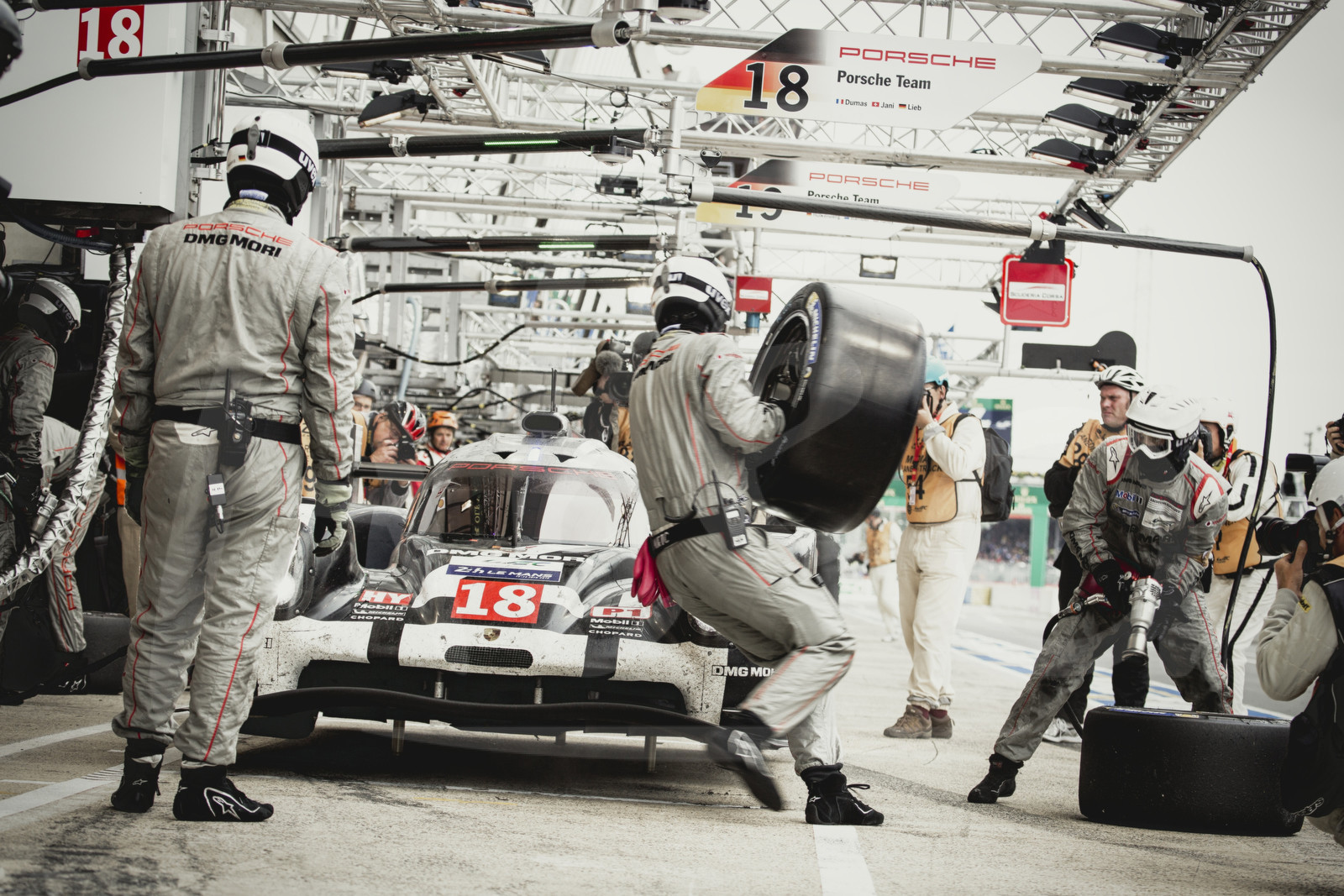 | Description | Le Mans 2015 - pitstop of an LMP1 Porsche. quick tire change, windscreen cleaning and of to race again.23 juin 2015 |