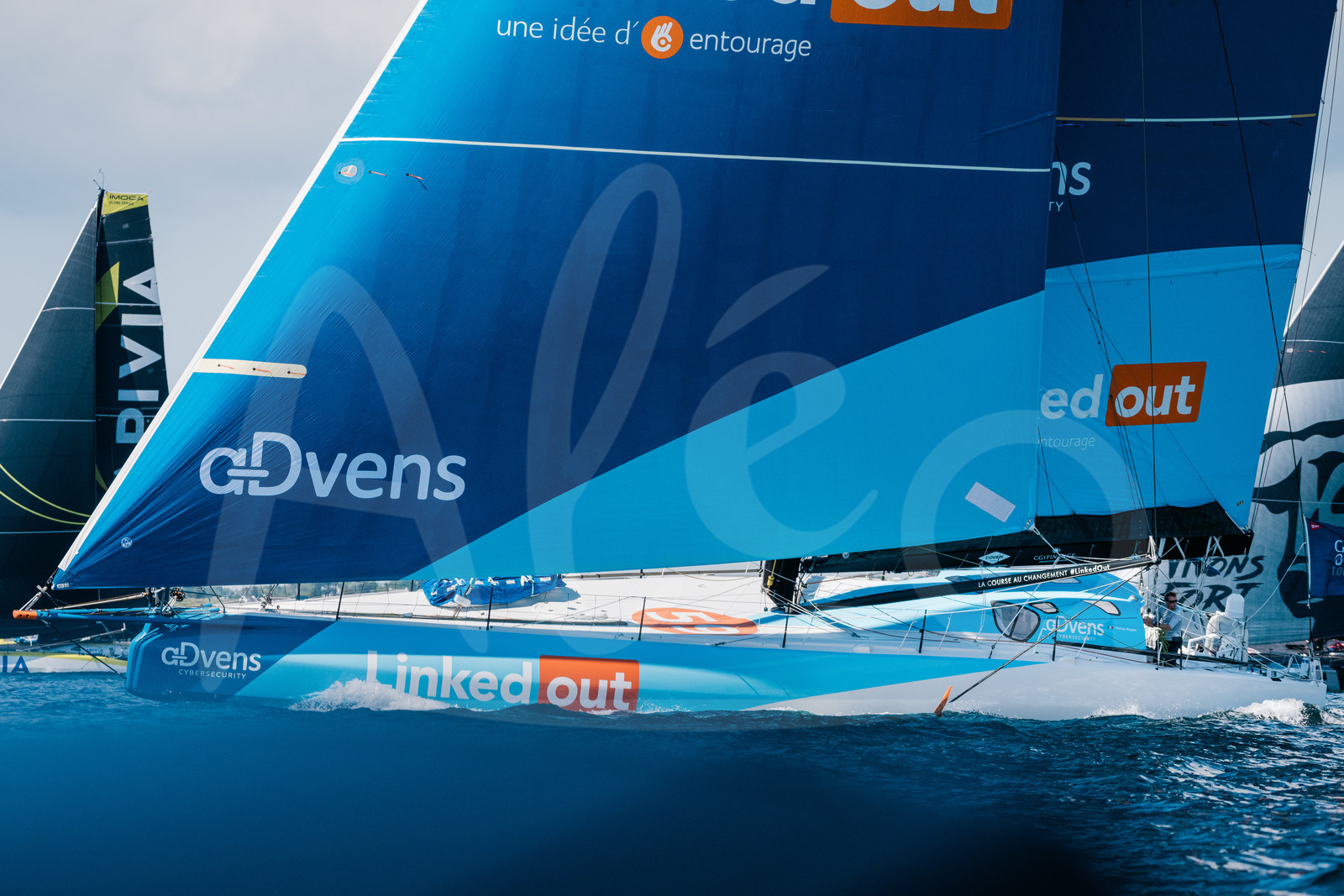 | Description | BREST, FRANCE - MAY 8 : Linkedout, skipper Thomas Ruyant, is illustrated during start of the Imoca Guyader Bermudes 1000 sailing race, in Brest, on May 8th, 2022. (photo by Jean-Louis Carli / Alea) |