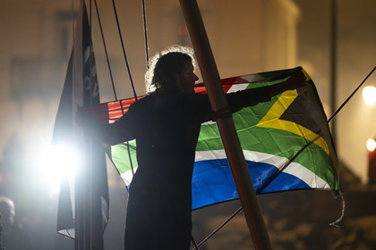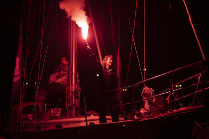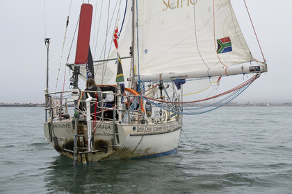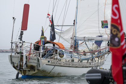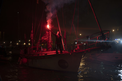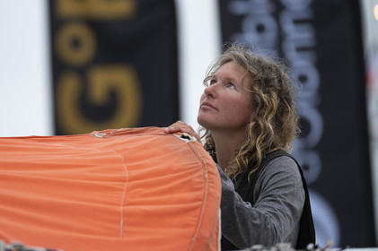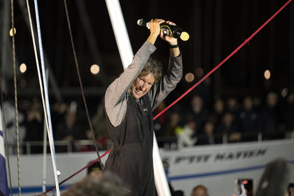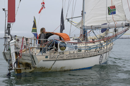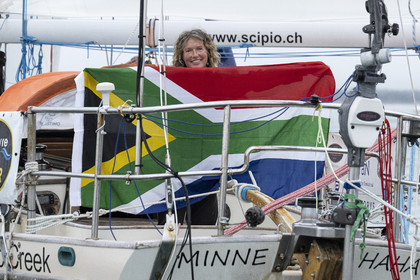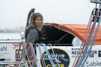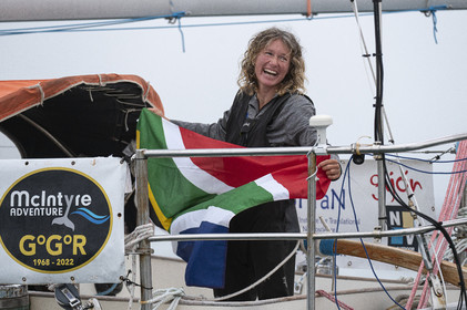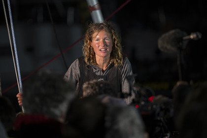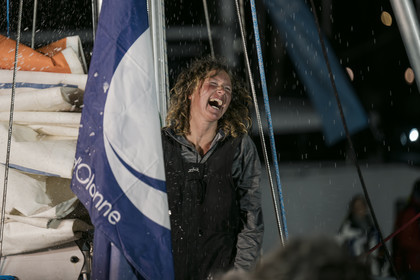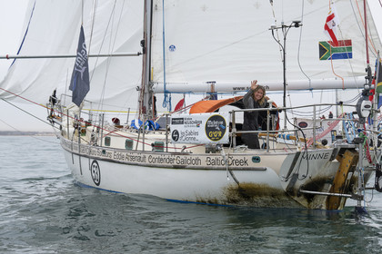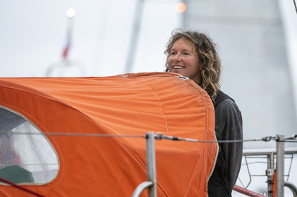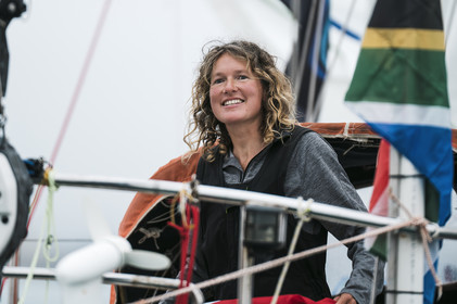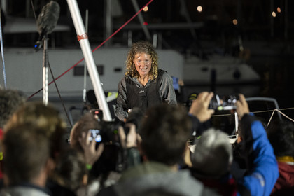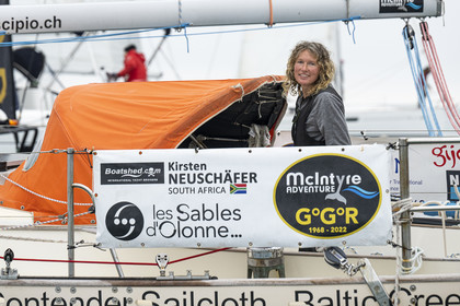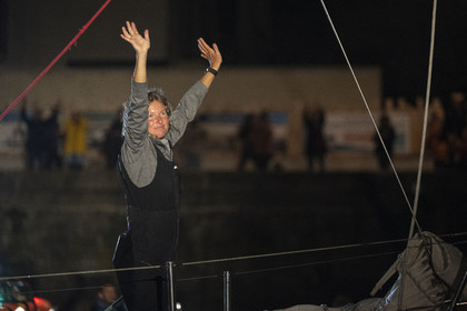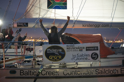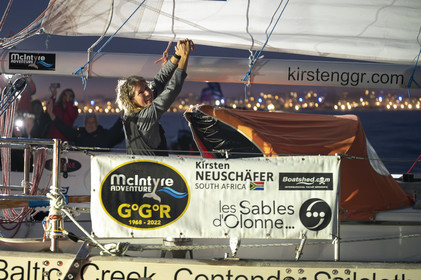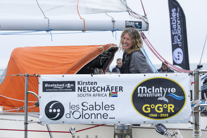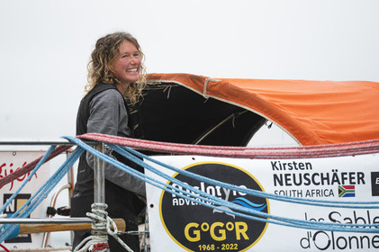 Arrival of the south african skipper Kirsten Neuschäfer, winner of the Golden Globe Race, round the world solo sailing race without any assistance or electronics, on April 27, 2023 in Les Sables d'Olonne. Photo Olivier Blanchet / Alea