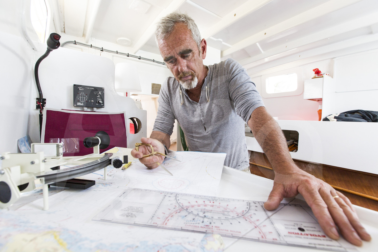 | Description | Loick Peyron inside his "Happy" boat in La Trinite sur Mer, Brittany, Peyron wants to sail this sistership of Mike Birch Olympus Photo, winner of the 1st Route du Rhum 1978, during the 2014 edition, using old method as a sextant and a compass - june 27, 2014 - Photo Jean Marie Liot / ALEA |