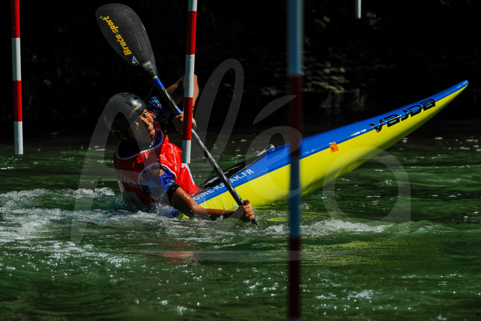 | Description | CHAMPS SUR MARNE, FRANCE - Juin 25, 2023 : Noa Nikiema Schwarz du Bac CK Sevres Issy, est photographié en action lors du championnat régional de canoë-kayak de Champs Sur Marne, le 25 juin 2023. (photo by Stéphane Allaman / Alea) |