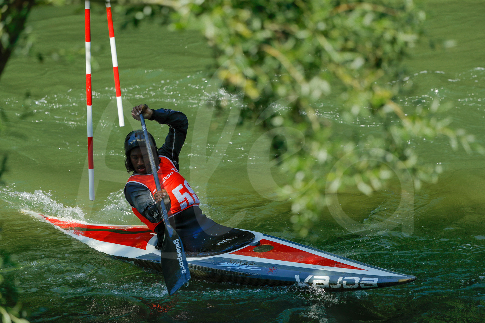 | Description | CHAMPS SUR MARNE, FRANCE - Juin 25, 2023 : Kavishan Kulatunga du Red Star Club Champigny, est photographié en action lors du championnat régional de canoë-kayak de Champs Sur Marne, le 25 juin 2023. (photo by Stéphane Allaman / Alea) |