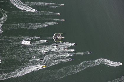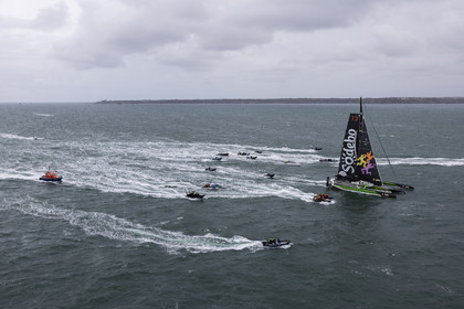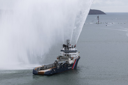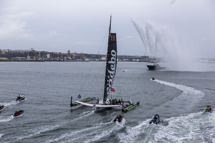 Photos de l'arrivée du vainqueur Charles Caudrelier sur le Maxi Trimaran Edmond de Rothschild - Gitana 17, à Brest, après une navigation de 50j 19h 7' 42"