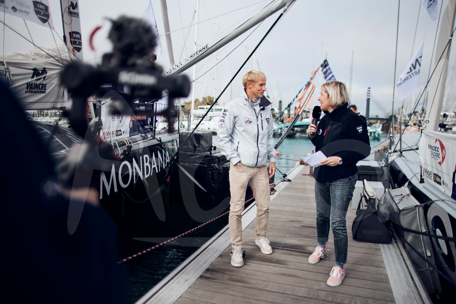 | Description | LES SABLES D'OLONNE, FRANCE - NOVEMBER 3, 2024: VandB - Monbana - Mayenne skipper Maxime Sorel (FRA) is being interviewed by media during the Vendée Live TV show at prestart of the Vendee Globe, on November 3, 2024 in Les Sables d'Olonne, France - (Photo by Anne Beauge / Alea) |