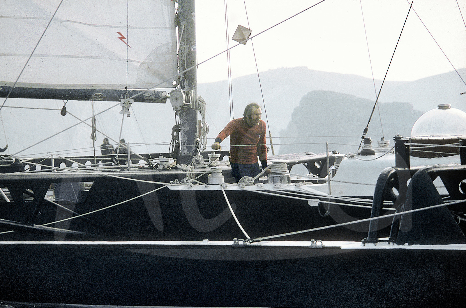 | Description | Au départ de la première route du Rhum, l'une des dernières photos d'Alain Colas à la barre de Manureva - Photo Bernard Rubinstein / Alea |