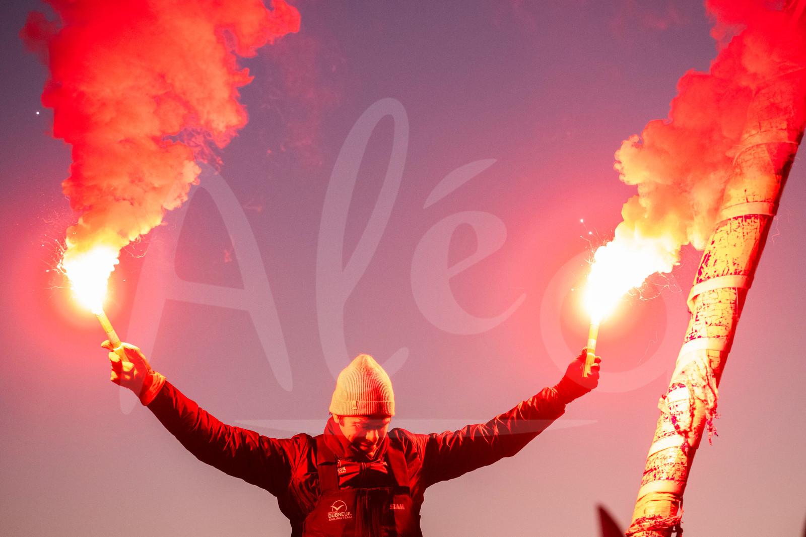| Description | LES SABLES D'OLONNE, FRANCE - JANUARY 17, 2025 : Groupe Dubreuil skipper Sébastien Simon (FRA) is photographed celebrating with flares after taking 3rd place in the Vendee Globe, on January 17, 2025 in Les Sables d'Olonne, France - (Photo by Vincent Curutchet / Alea) |