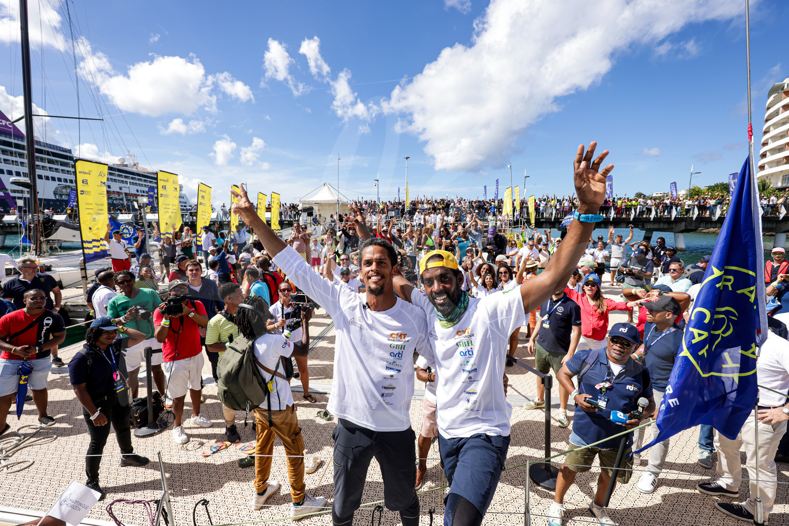| Description | FORT-DE-FRANCE, MARTINIQUE : Class 40 Martinique Horizon, skippers Jean-Yves Aglae and Moane Mangatalle celebrate taking 34th place of leg 2 in their category of the Transat Café l'OR 2025 on November 23, 2025 in Fort-de-France, Martinique. (Photo by Georgia Schofield / TCO25) |
