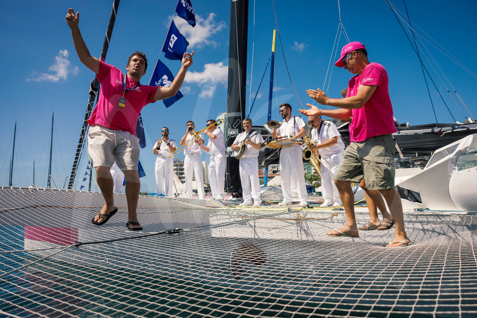 | Description | FORT-DE-FRANCE, MARTINIQUE : Illustration of the National Marine music band playing on Ocean Fifty Mon Bonnet Rose, skippers Laurent Bourguès and Arnaud Vasseur, on the village of the Transat Café l'OR 2025 on November 11, 2025 in Fort-de-France, Martinique. (Photo by Jean-Marie Liot / Alea) |