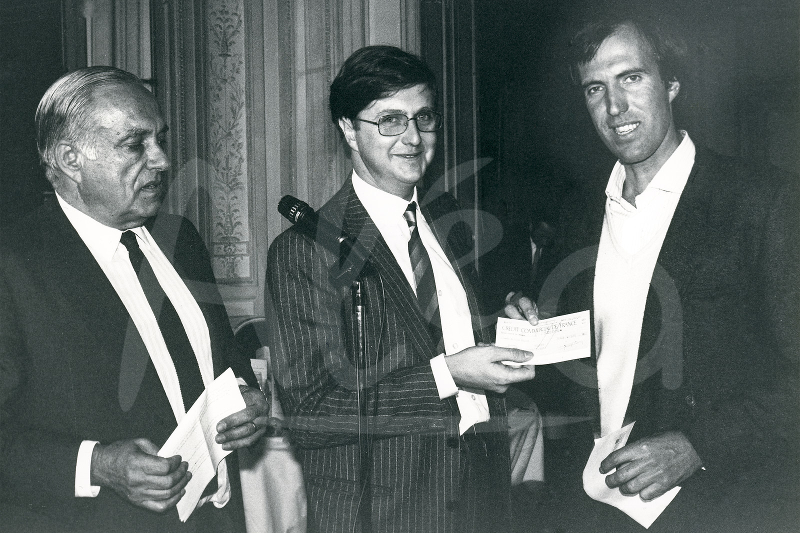 | Description | Remise des prix de l'édition 1982 de la Route du Rhum, au skipper vainqueur Marc Pajot (Elf Aquitaine), par Florent de Kersauson et Michel Etévenon, 1982 - Photo Christian Février |