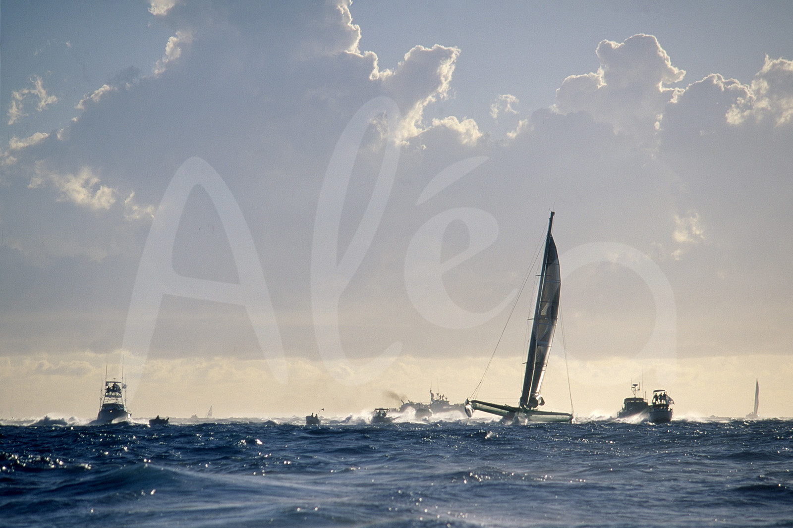 | Description | Vainqueur, Skipper Florence Arthaud, trimaran Pierre 1er, à l'arrivée de la Route du Rhum, à Pointe A Pitre, Guadeloupe, le 18 Novembre 1990 - Photo Bernard Rubinstein / ALEA |