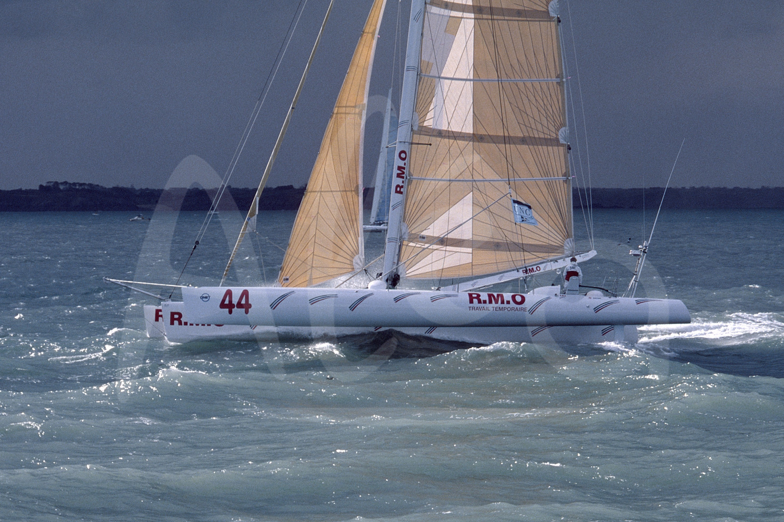 | Description | Action du Skipper Laurent Bourgnon, trimaran RMO, pendant le départ de la Route du Rhum, à St-Malo, Bretagne, le 4 Novembre 1990 - Photo Bernard Rubinstein / ALEA |
