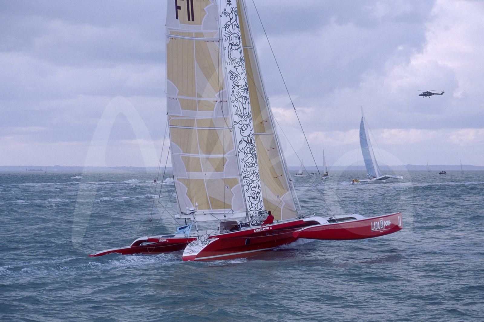 | Description | Action du Skipper Loick Peyron, trimaran Lada Poch IV, pendant le départ de la Route du Rhum, à St-Malo, Bretagne, le 4 Novembre 1990 - Photo Bernard Rubinstein / ALEA |