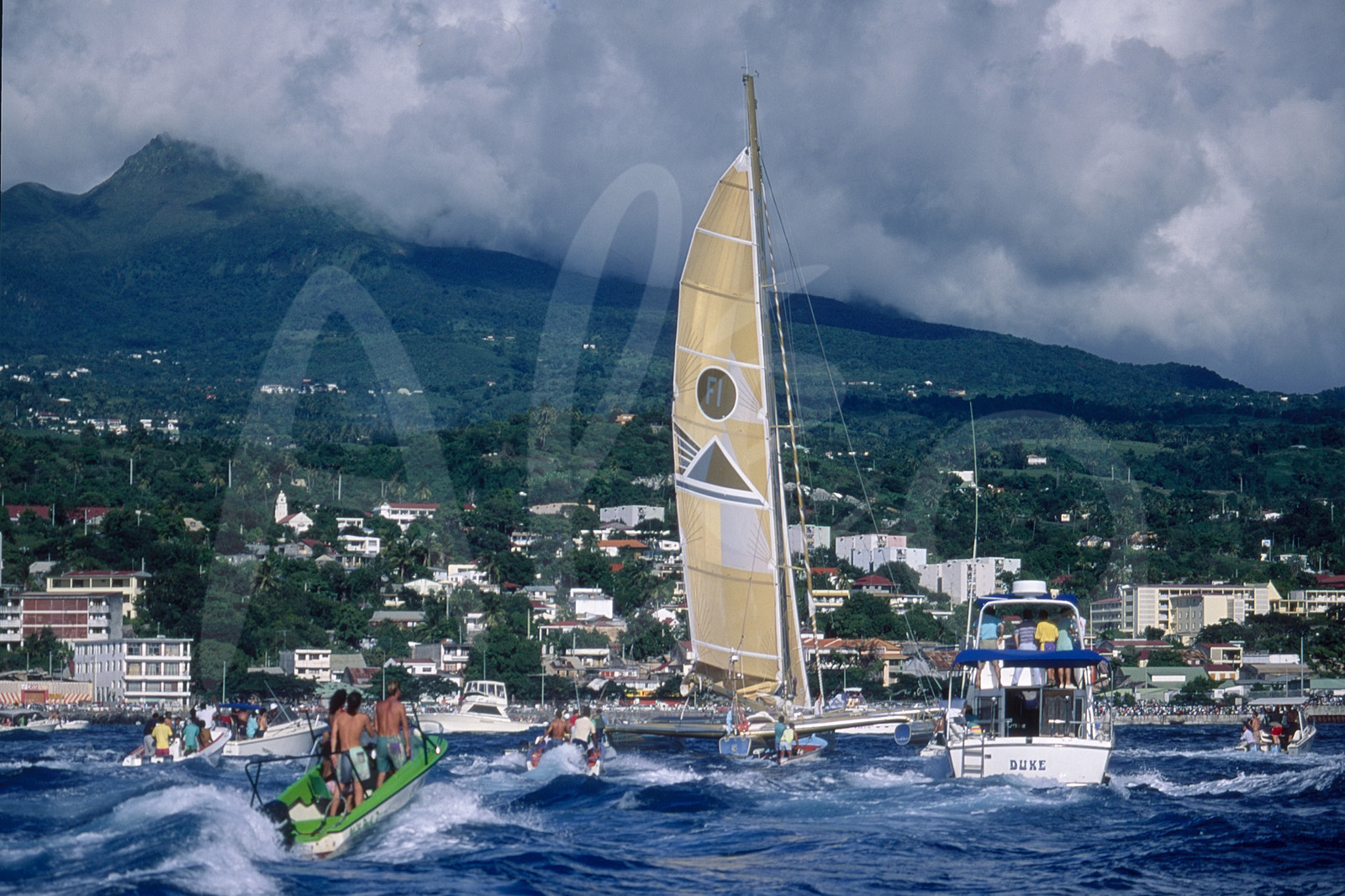 | Description | Vainqueur, Skipper Florence Arthaud, trimaran Pierre 1er, à l'arrivée de la Route du Rhum, à Pointe A Pitre, Guadeloupe, le 18 Novembre 1990 - Photo Bernard Rubinstein / ALEA |