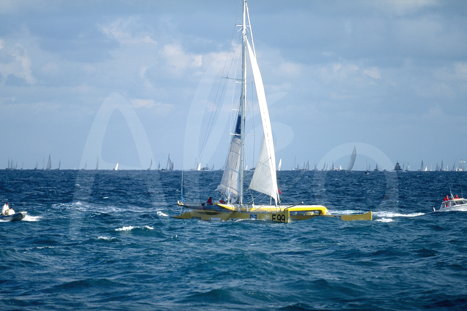 | Description | Action du Skipper Henri Cornier, catamaran Groupe JP Turco, pendant le départ de la Route du Rhum, à St-Malo, Bretagne, le 4 Novembre 1990 - Photo Bernard Rubinstein / ALEA |