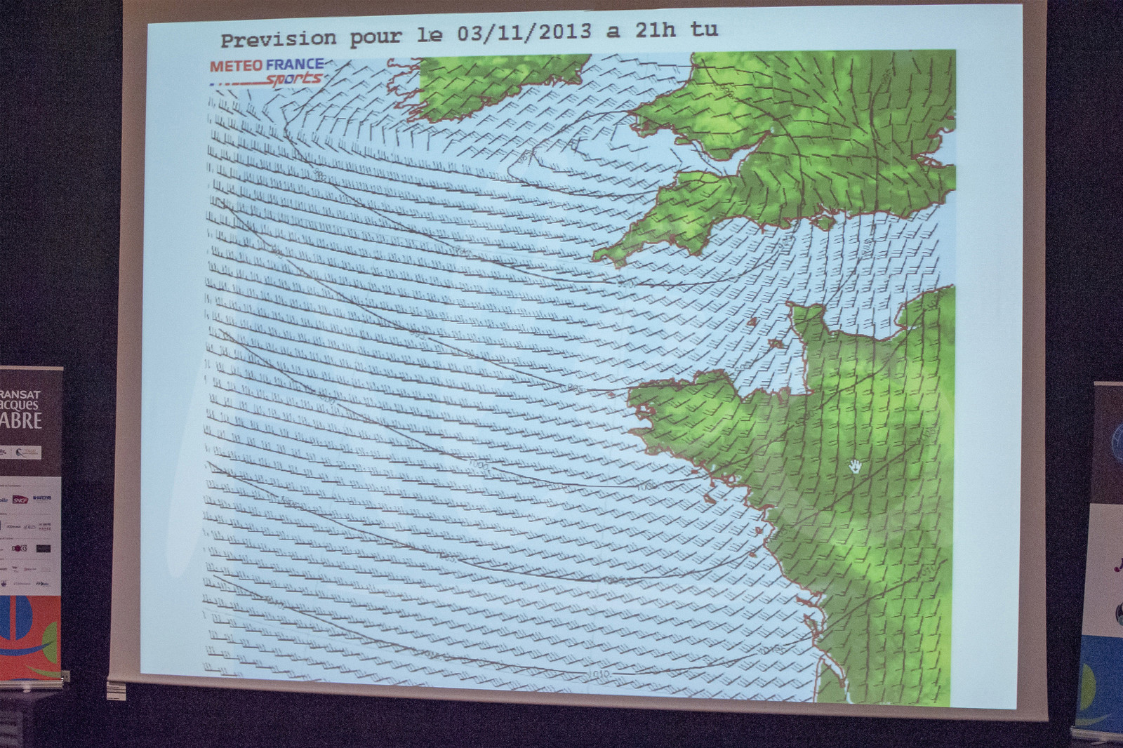 | Description | Richard Silvani (Meteo France) explaining the weather forecast for Sunday and monday today} the skippers and postpone of the start of the Transat Jacques Vabre in Le Havre (North France) on November 02, 2013 - Photo Olivier Blanchet / ALEA - |
