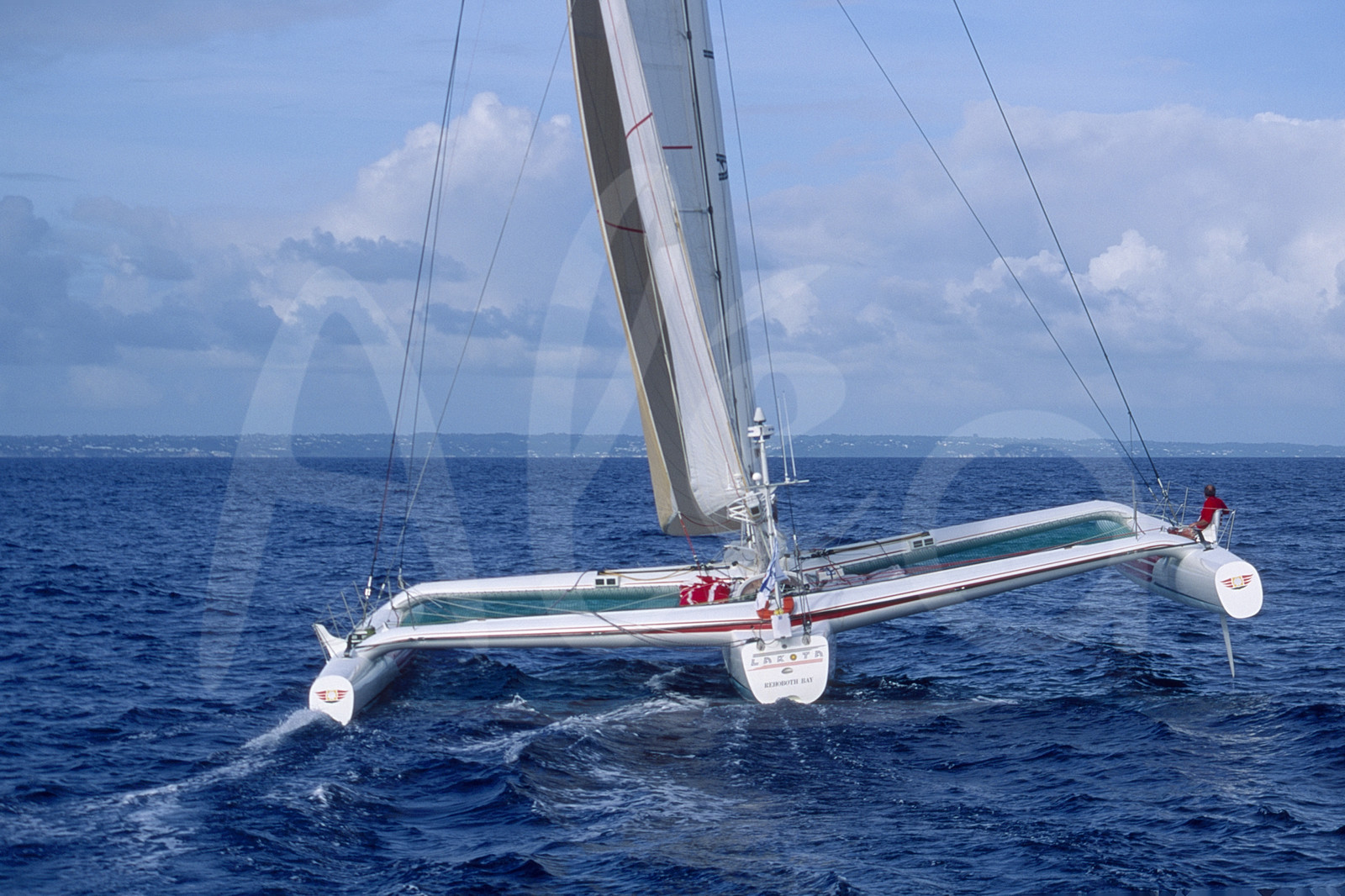 | Description | Action du Skipper Steve Fossett, trimaran Lakota (Ex-Pierre 1er), à l'arrivée de la Route du Rhum, à Pointe A Pitre, Guadeloupe, le 23 Novembre 1994 - Photo Bernard Rubinstein / ALEA |