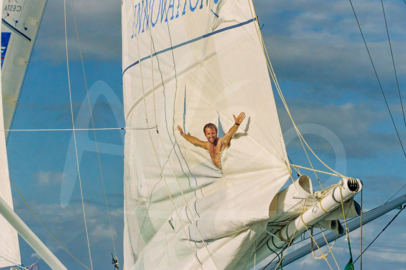 | Description | Arrivée de Thomas Coville, vainqueur de la Roue du Rhum 1998 en catégorie IMOCA à bord d'Aquitaine Innovation, à Pointe à Pitre, Guadeloupe, Photo : Jean-Marie Liot / Alea.###.Arrival Thomas Coville, winner Roue du Rhum 1998 in IMOCA ranking onboard Aquitaine Innovation, Pointe à Pitre, Guadeloupe, Photo : Jean-Marie Liot / Alea |