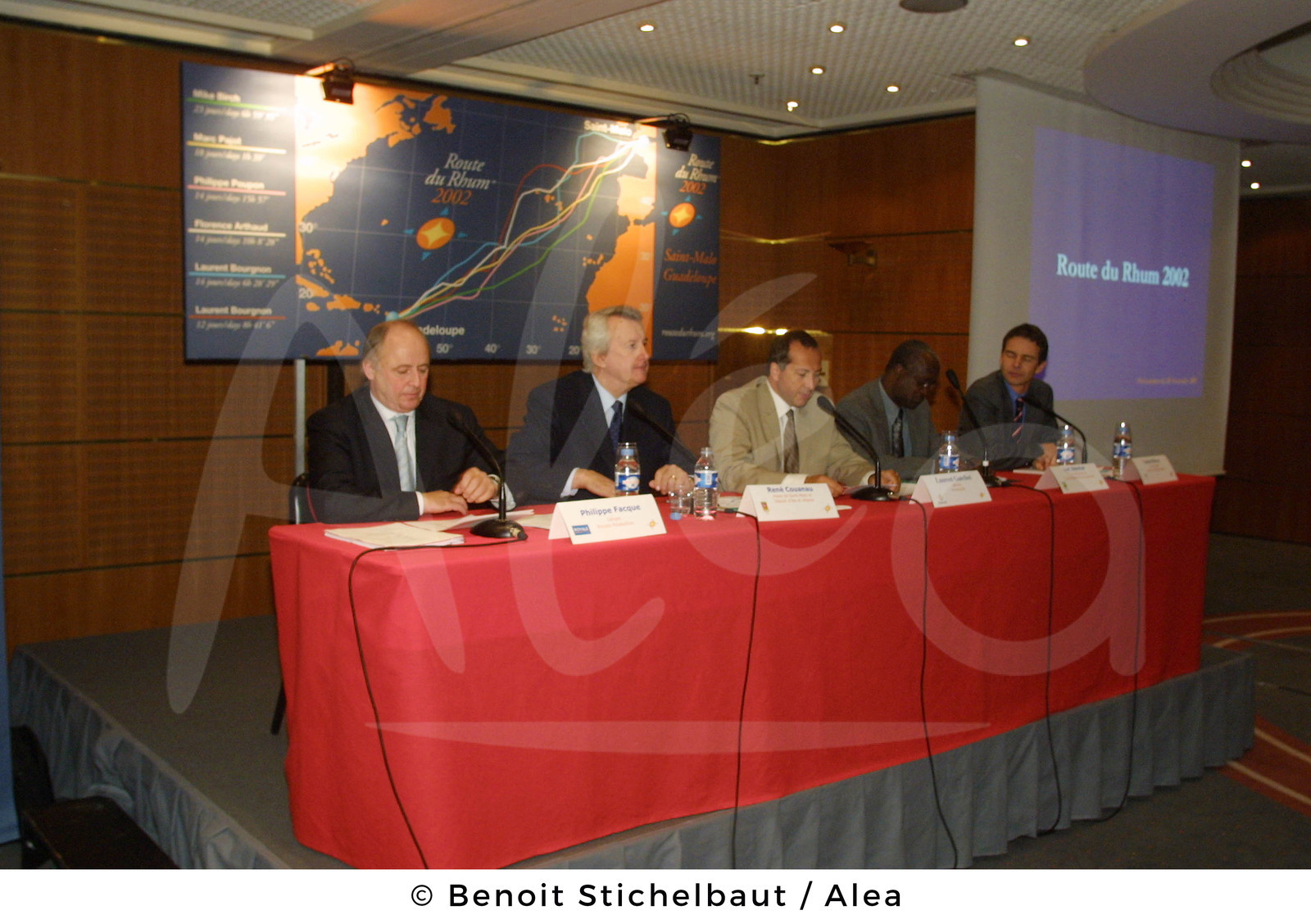 | Description | SAILING - PRESS CONFERENCE ROUTE DU RHUM 2002 - 30/11/2001 - PHOTO: BENOIT STICHELBAUT / ALEA.PHILIPPE FACQUE (ROYALE PRODUCTION) / RENE COUANAU (ST-MALO MAYOR) / LAURENT GUECHOT (GERANT PROMOVOILE) / LUC ADEMAR (GUADELOUPE) / LUCIEN BOYER (HAVAS ADVERTISING SPORTS) |
