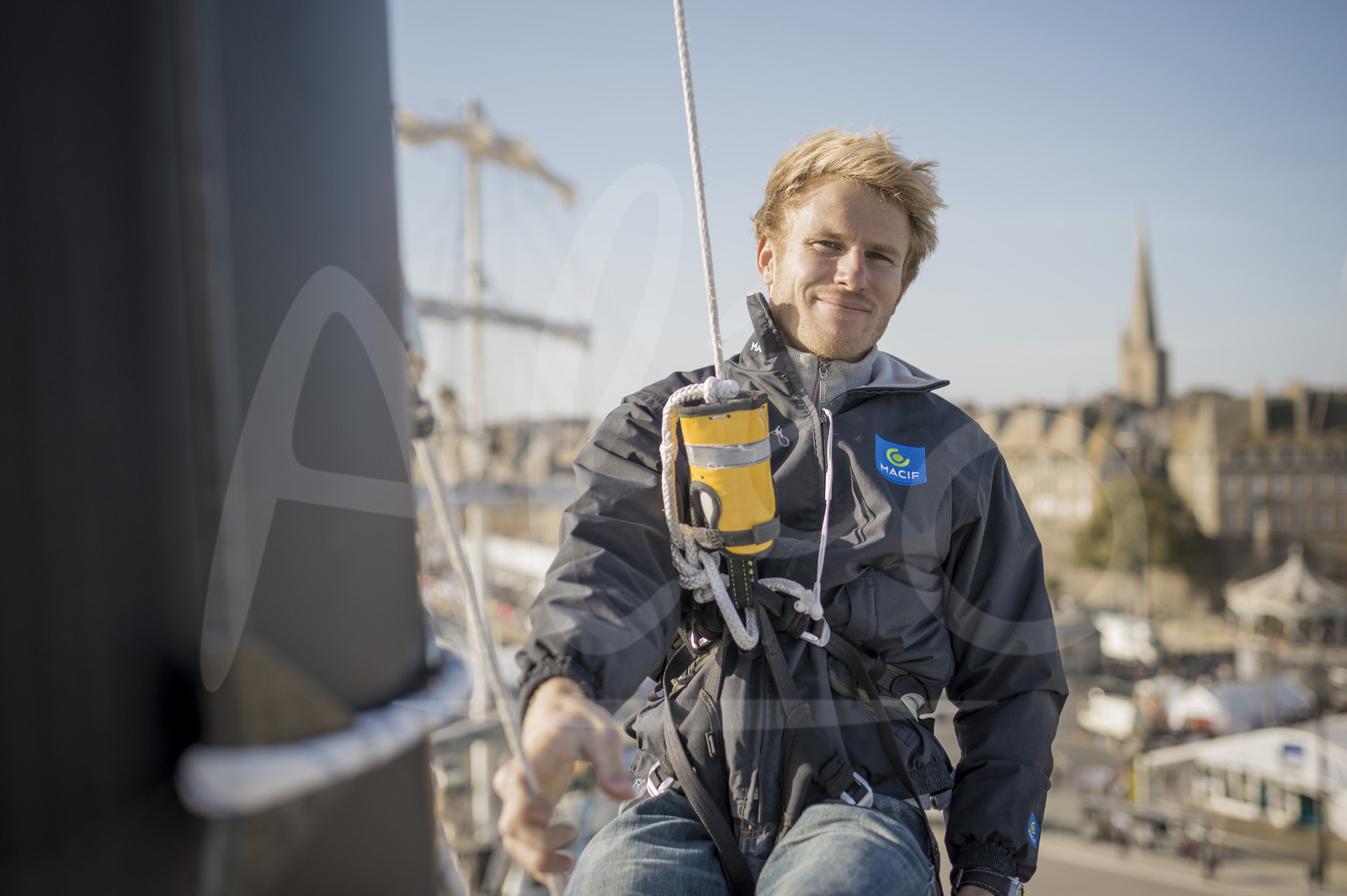 | Description | Portrait shots of Francois Gabart, skipper of IMOCA MACIF up his mast on october 31, 2014 before the Route du Rhum sailing race to start on november 02, 2014 - Photo Vincent Curutchet / ALEA |