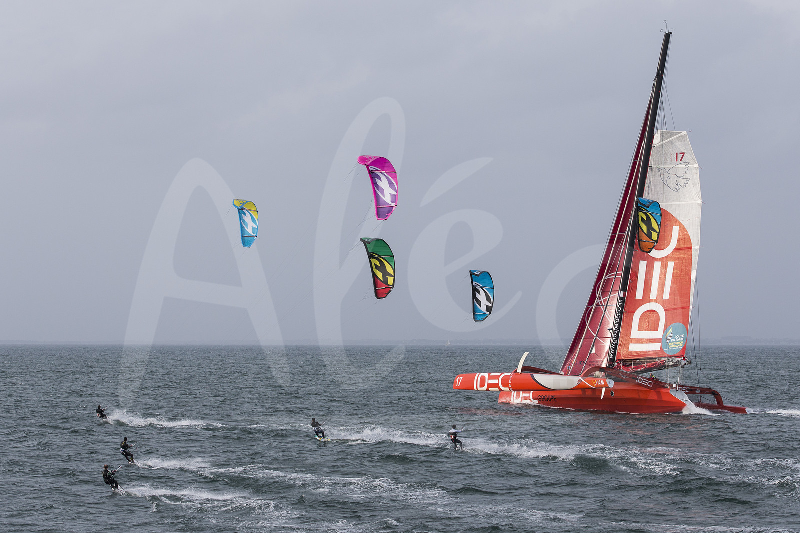| Description | Ultime category and maxi trimaran IDEC SPORT, french skipper Francis Joyon, back from training and sailing alongside with Kitesurfers off La Trinite, South Brittany, prior to the start of the Route du Rhum Destination Guadeloupe, on october 08, 2014 - Photo Jean Marie Liot / ALEA |