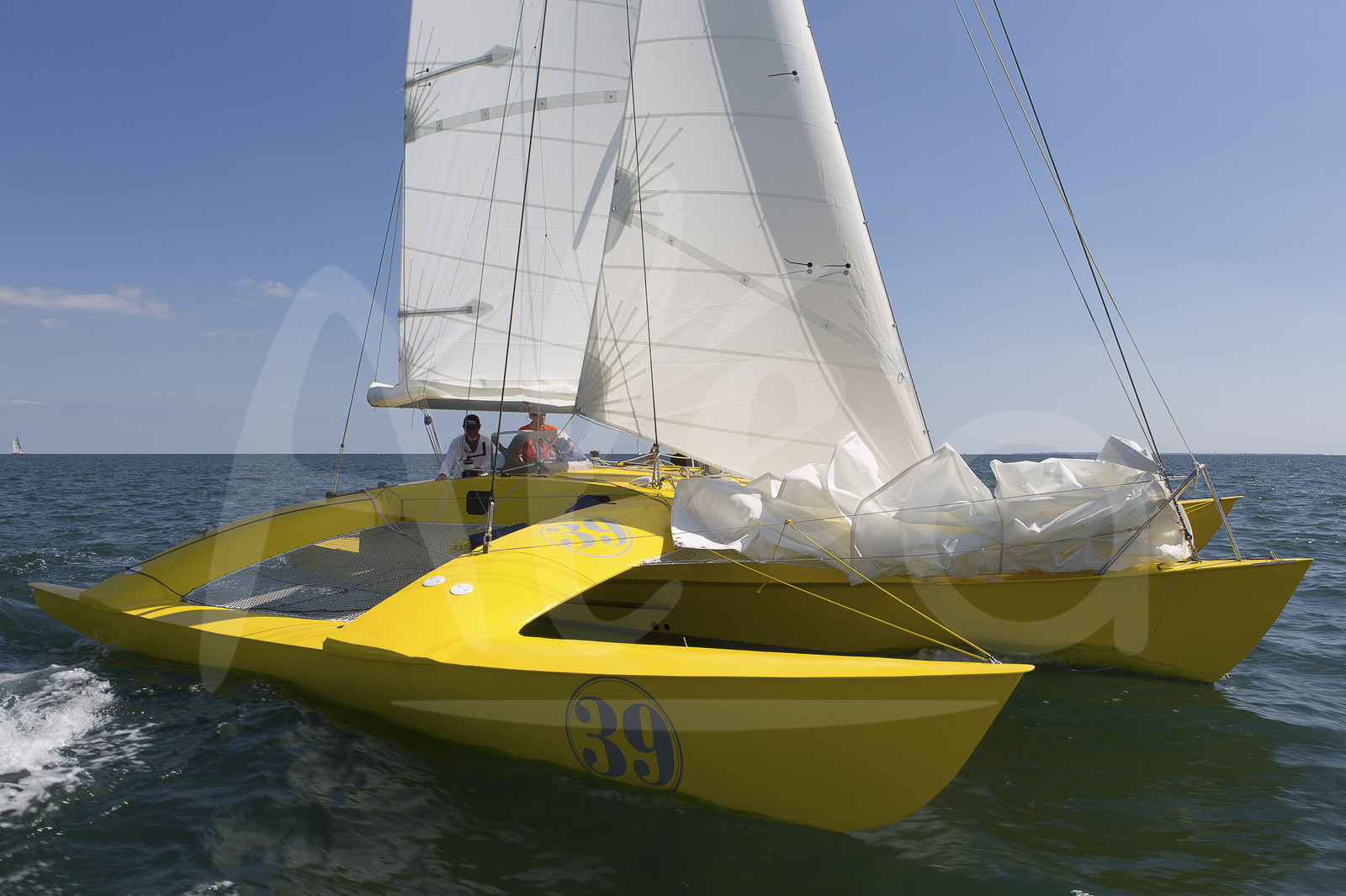 | Description | Very first sail for Loick Peyron "Happy" boat off Vannes, Brittany, Peyron wants to sail this sistership of Mike Birch Olympus Photo, winner of the 1st Route du Rhum 1978, during the 2014 edition, using old method - june 19, 2014 - Photo Jean Marie Liot / ALEA |