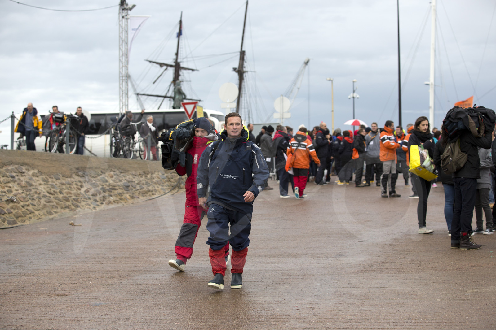 | Description | Sebastien Josse, skipper of the Ultime Edmond de Rothschild and a media man to join his boat before the Route du Rhum sailing race start on november 02, 2014 - Photo Jean Marie Liot / ALEA |