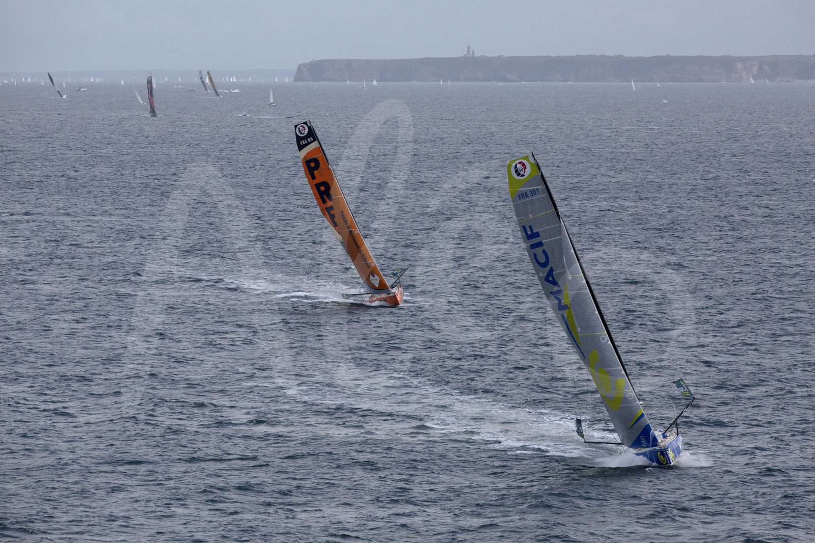 | Description | Francois Gabart, skipper of the Imoca MACIF and Vincent Riou, skipper of the Imoca PRB during the Route du Rhum sailing race start on november 02, 2014 - Photo Jean Marie Liot / ALEA |