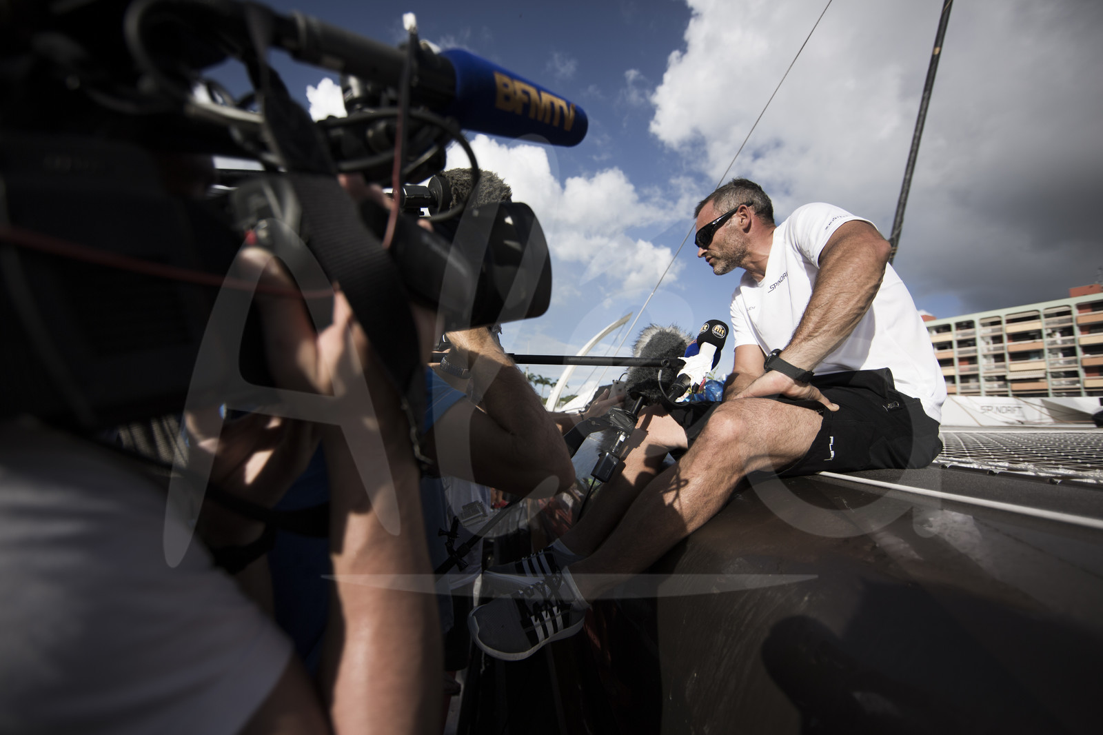 | Description | Yann Guichard, skipper of the maxi trimaran Spindrift 2, Ultime category, talks to the media after finishing 2nd in the Route du Rhum Destination Guadeloupe, in Pointe ‡ Pitre, Guadeloupe, on november 10, 2014 - Photo Mark Lloyd / ALEA |