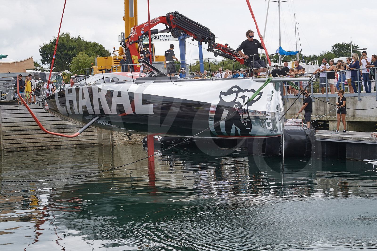 | Description | Launching of the new IMOCA CHARAL, skipper Jeremie BEYOU, at CDK shipyard in Port La Foret (France), on August 22nd, 2018 - Photo Yvan Zedda / Alea |