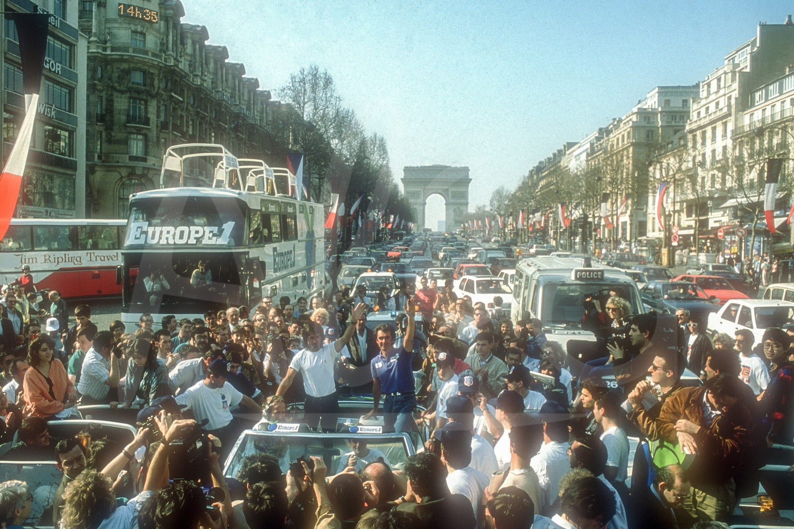 | Description | Titouan Lamazou and Loick Peyron going down the Champs Elysees after respectively finishing 1st and 2nd of the very first Vendee Globe 1989-1990, in Paris, France, on march 18, 1990 - Photo Henri Thibault / Alea |