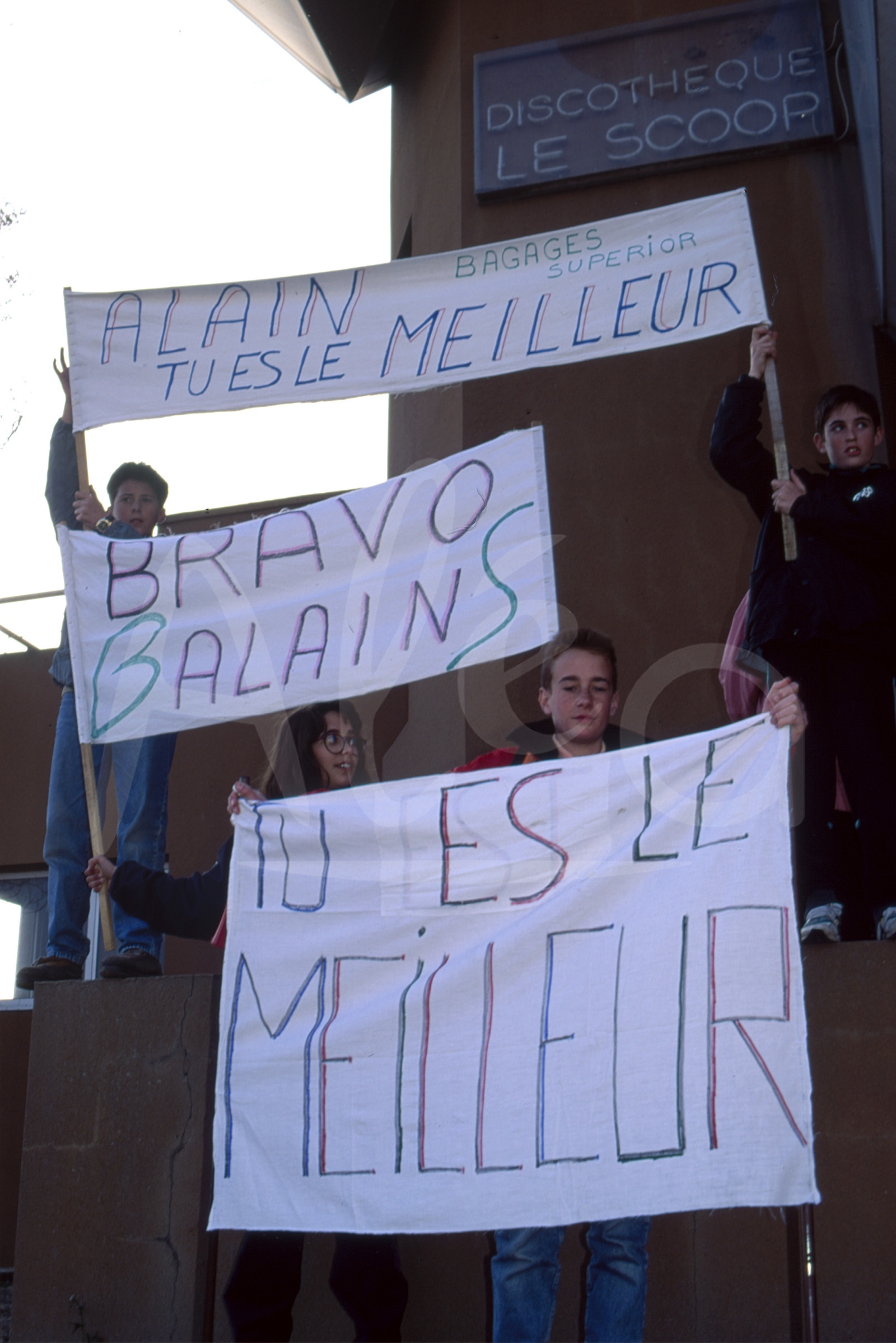 | Description | Public illustration for Winner Alain GAUTIER, Bagages Superior, in the channel after crossing the finish line of the round-the-world solo sailing yacht race Vendee Globe in Les Sables d'Olonne, West France, on March 13th, 1993, in 110d 02h 22mn 35s - © Bernard Rubinstein / Alea |