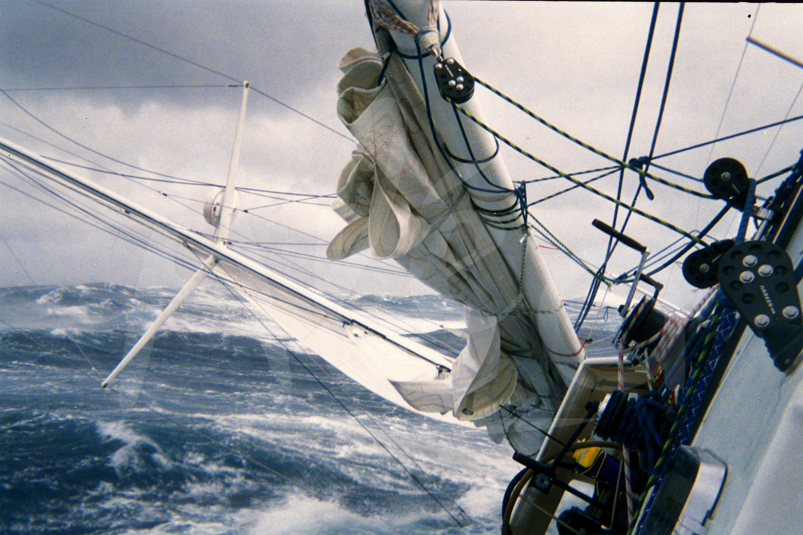 | Description | Dangerous position shot during a storm with 75 knots winds near Cape Horn by the skipper Nandor Fa, K&H Bank Matav, during the solo sailing round-the-world yacht race Vendee Globe, 2nd edition, in December 1992 © Nandor Fa / Alea. |