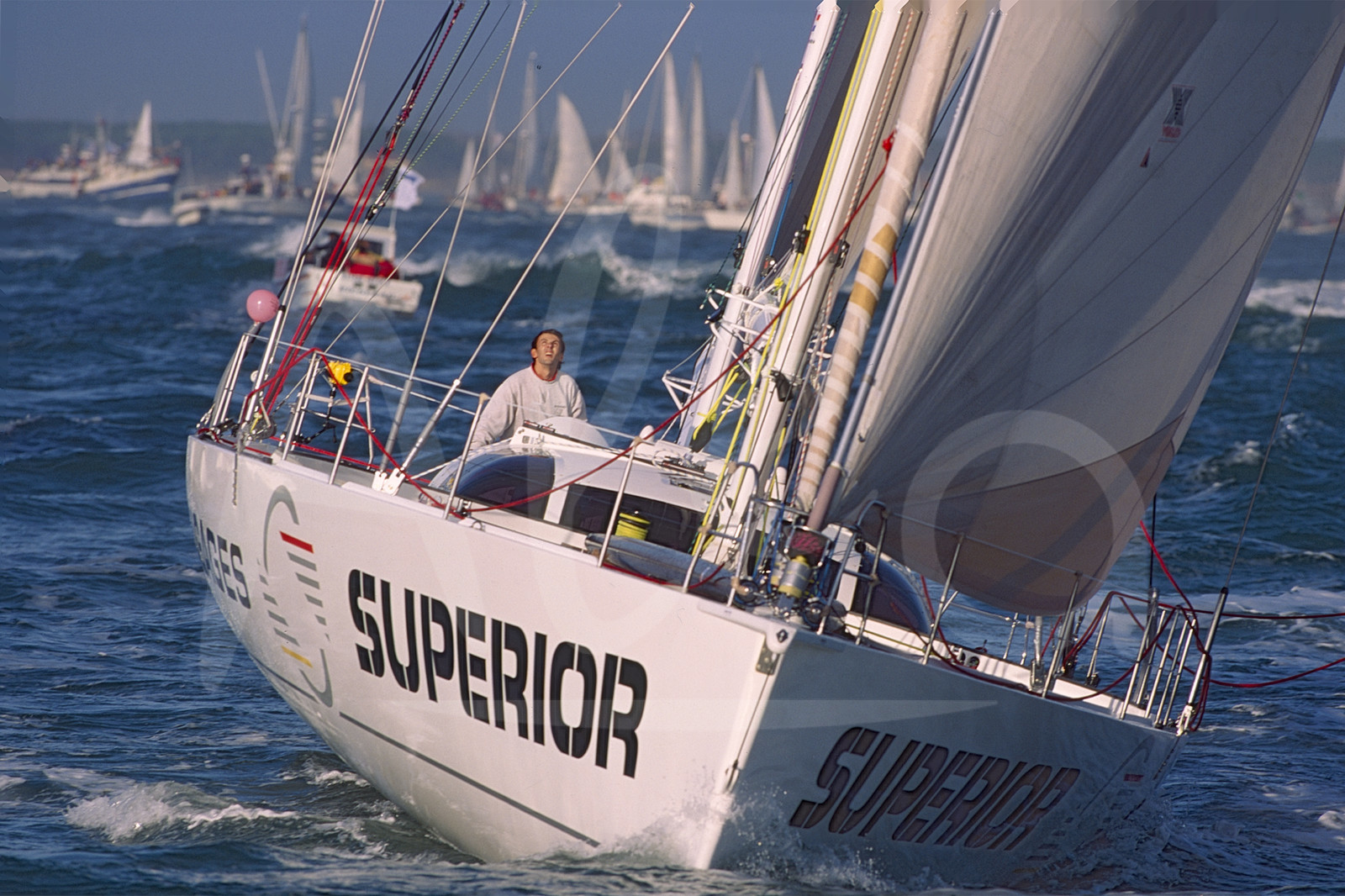 | Description | French skipper Alain GAUTIER, Bagages Superior, during start of the solo circumnavigation sailing race Vendee Globe, 2nd edition, on November 22nd 1992, starting from Les Sables d'Olonne, France - © Bernard Rubinstein / Alea |