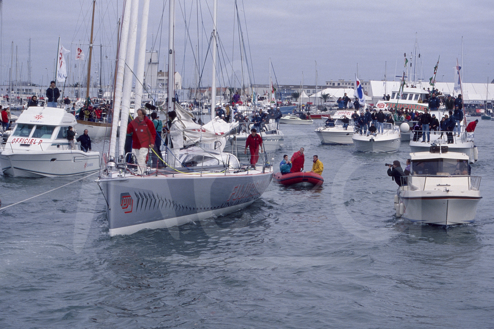 | Description | Loick PEYRON, Fujicolor III, being towed to the start of the round-the-world solo sailing yacht race Vendee Globe in Les Sables d'Olonne, West France, on November 22nd, 1992 - © Bernard Rubinstein / Alea |