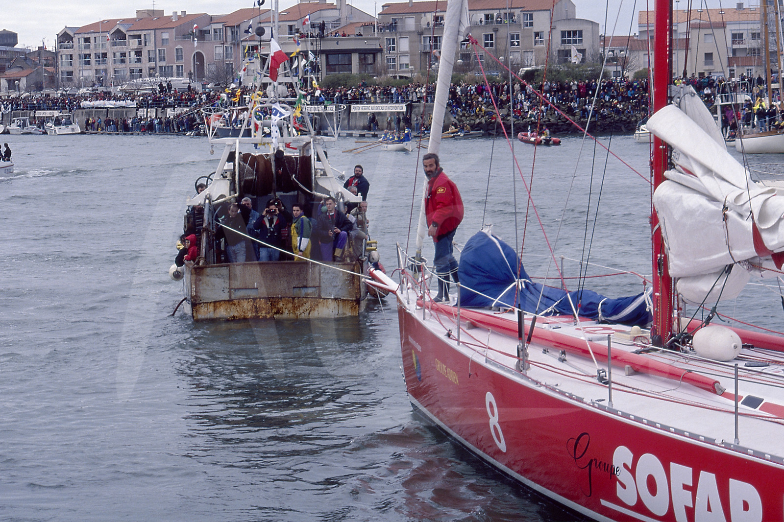 | Description | Jean-Luc VAN DEN HEEDE, Groupe Sofap Helvim, being towed in the channel before start of the round-the-world solo sailing yacht race Vendee Globe in Les Sables d'Olonne, West France, on November 22nd, 1992 - © Bernard Rubinstein / Alea |