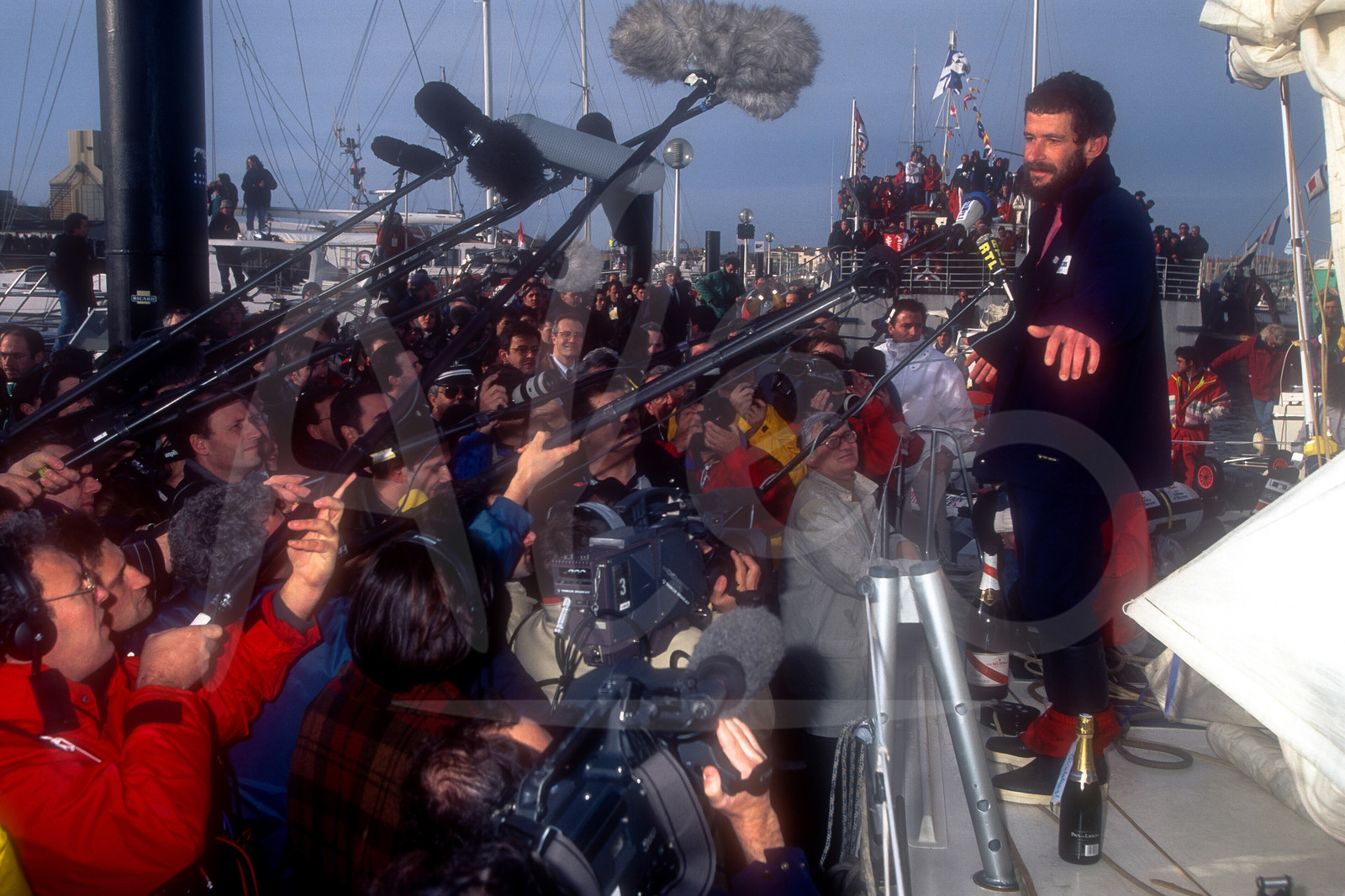 | Description | Winner Christophe Auguin, Geodis, with media on his return during the Vendee Globe 1996-1997, in Les Sables d'Olonne, France, on february 17, 1997 - Photo Jacques Vapillon / ALEA |