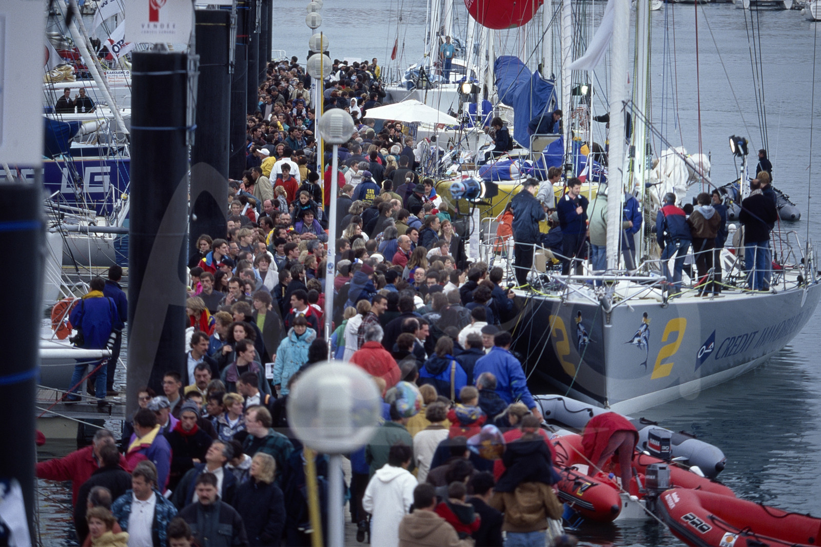 | Description | Illustration of pontoons before start of the round-the-world solo sailing yacht race Vendee Globe in Les Sables d'Olonne, West France, on November 3rd,1996 - © Henri Thibaut / Alea |