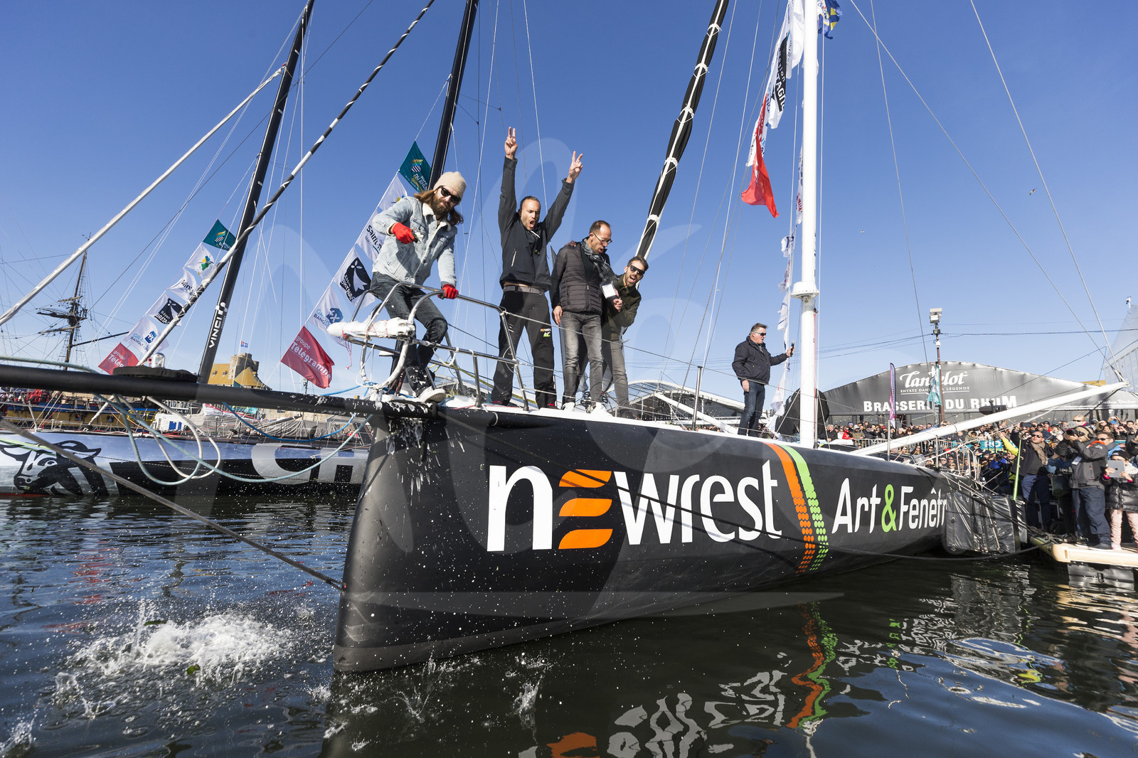 | Description | Christening by the DJ "Breakbot and Irfane", godfathers of IMOCA Newrest – Arts & Fenetres, skipper Fabrice Amedeo, together with Yohann Diniz, French race walker, during the pre-start of the Route du Rhum 2018, on November 3rd, 2018 in St-Malo, north Brittany, France - Photo Jean-Marie Liot / Newrest – Arts & Fenetres |