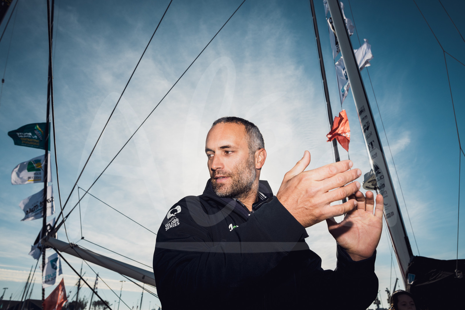 | Description | Christening by the DJ "Breakbot and Irfane", godfathers of IMOCA Newrest – Arts & Fenetres, skipper Fabrice Amedeo, together with Yohann Diniz, French race walker, during the pre-start of the Route du Rhum 2018, on November 3rd, 2018 in St-Malo, north Brittany, France - Photo Jean-Louis Carli / Alea |