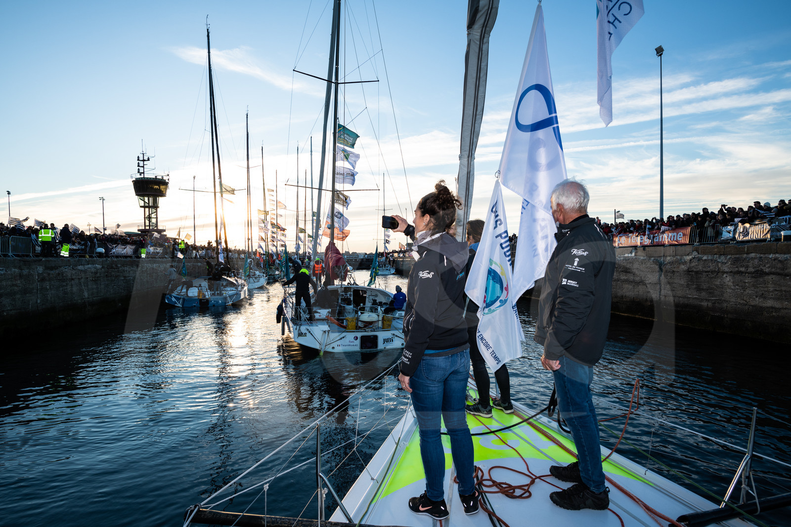 | Description | On board class 40 Imerys clean energy, skipper Phil Sharp, leaving pontoons to move towards his boat during start of the Route du Rhum 2018, on November 3rd, 2018 in St-Malo, north Brittany, France - Photo Jean-Louis Carli / Alea |