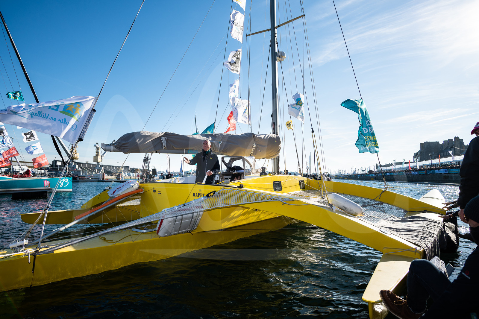 | Description | Illustration Rhum Multi Happy, skipper Loick Peyron, leaving pontoon during the pre-start of the Route du Rhum 2018, on November 3rd, 2018 in St-Malo, north Brittany, France - Photo Jean-Louis Carli / Alea |