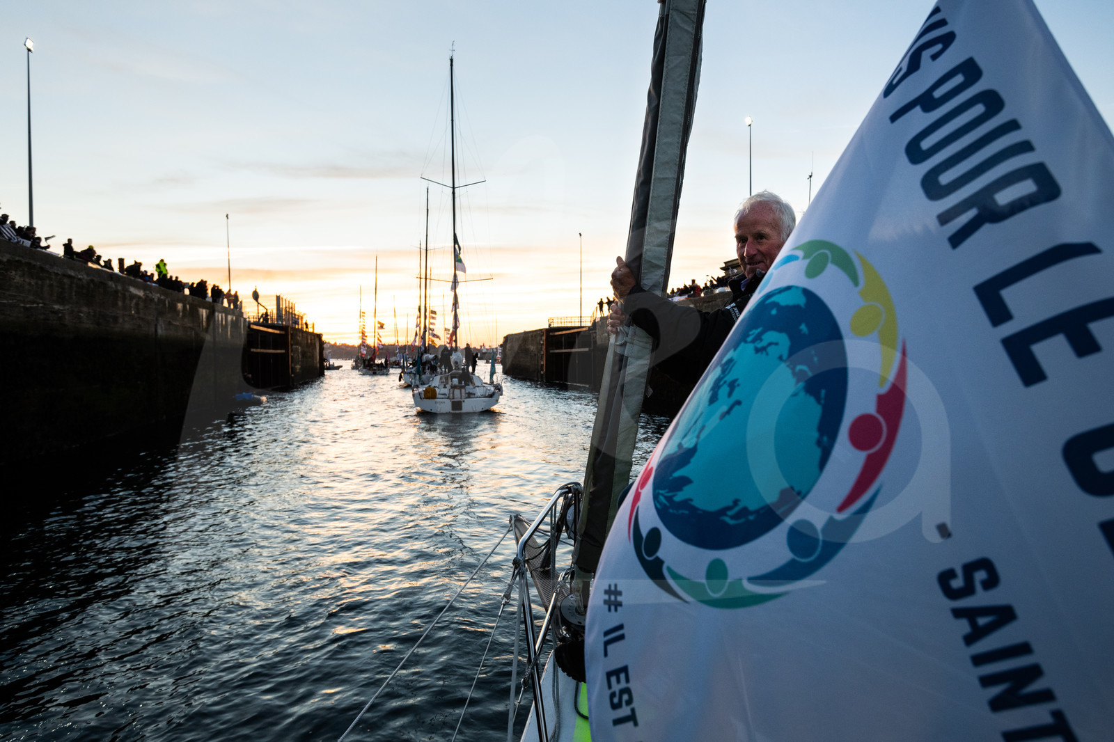 | Description | On board class 40 Imerys clean energy, skipper Phil Sharp, leaving pontoons to move towards his boat during start of the Route du Rhum 2018, on November 3rd, 2018 in St-Malo, north Brittany, France - Photo Jean-Louis Carli / Alea |